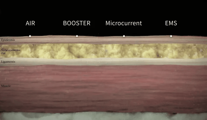 Derma Shot Mode : EMSDerma Shot mode stimulates sagging skin and care for muscles to create a firmer facial contour Facial contour care by applying mid-frequency EMS optimized for facial muscles to stimulate muscles that have lost elasticity.