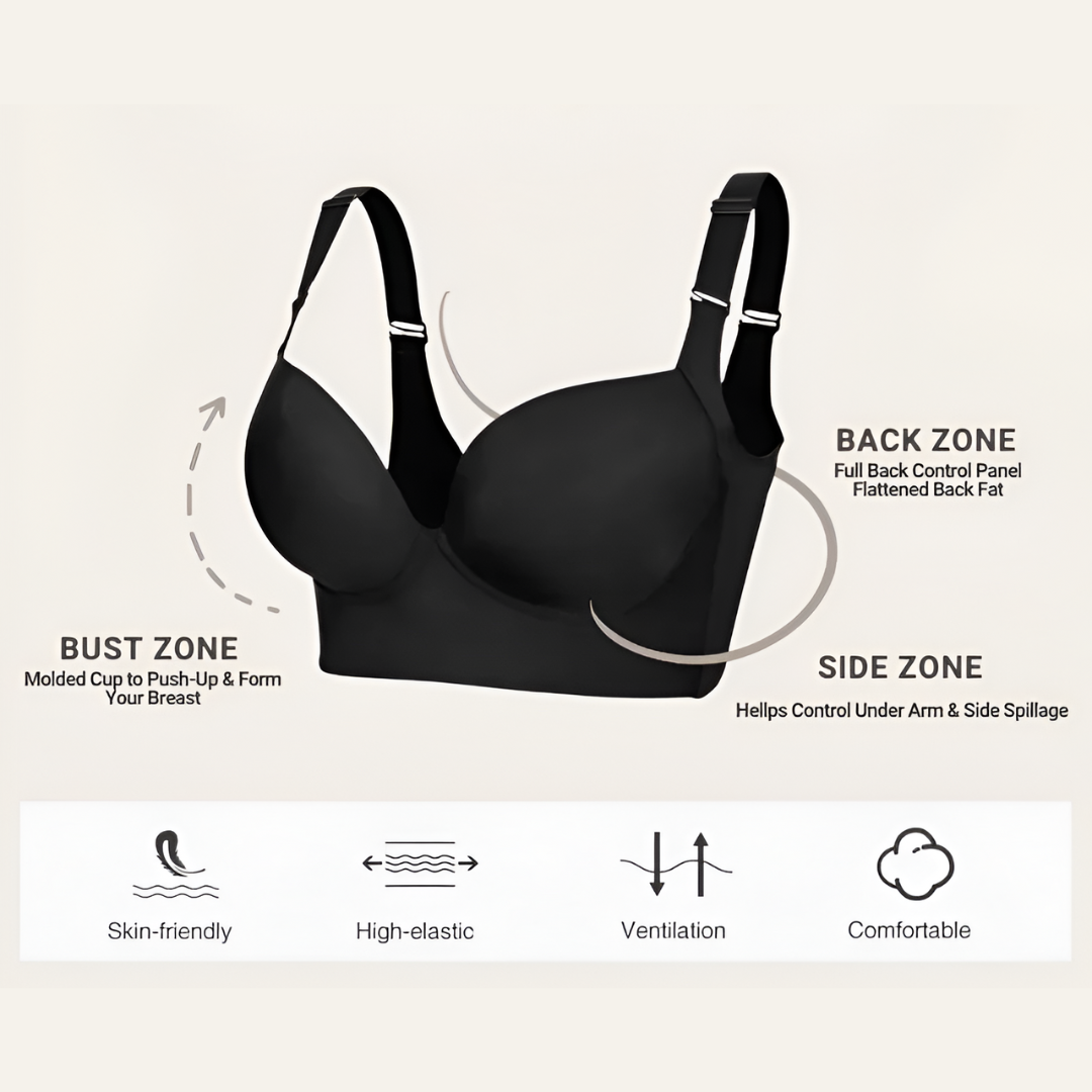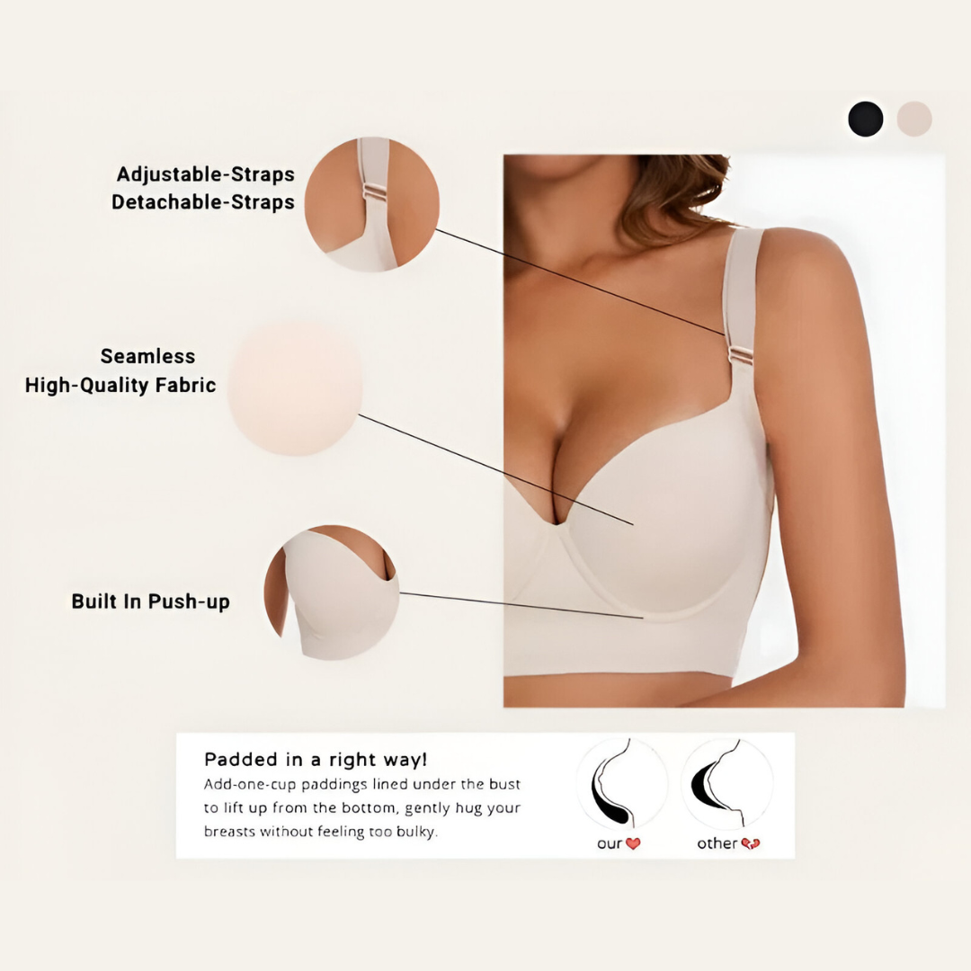 Our bra is a game-changer with its unique design that offers unparalleled shaping and support. Unlike other bras, it features a wide back for smoothing, comfy straps, and a perfect lift. Discover the difference with our bra, providing unmatched comfort and a stunning silhouette.