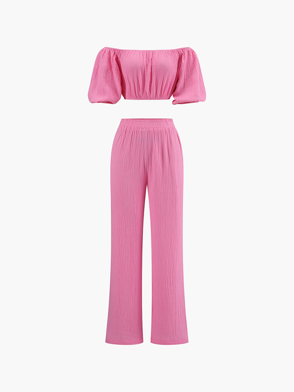 Discover the comfort and versatility of the Cotton Blends Pants Set. This set consists of a lightweight blouse and pants made from a high-quality cotton blend, providing a relaxed fit that's pleasant to the touch.