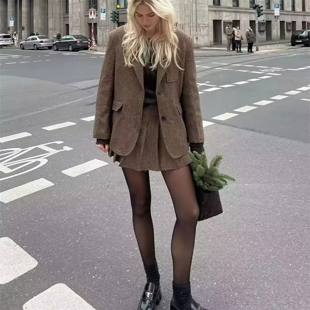 Stand out with the Vintage Two-Piece Set, a perfect choice for those who appreciate retro style. This set is made up of a charming blazer and a coordinated skirt, creating a sophisticated and timeless look.
