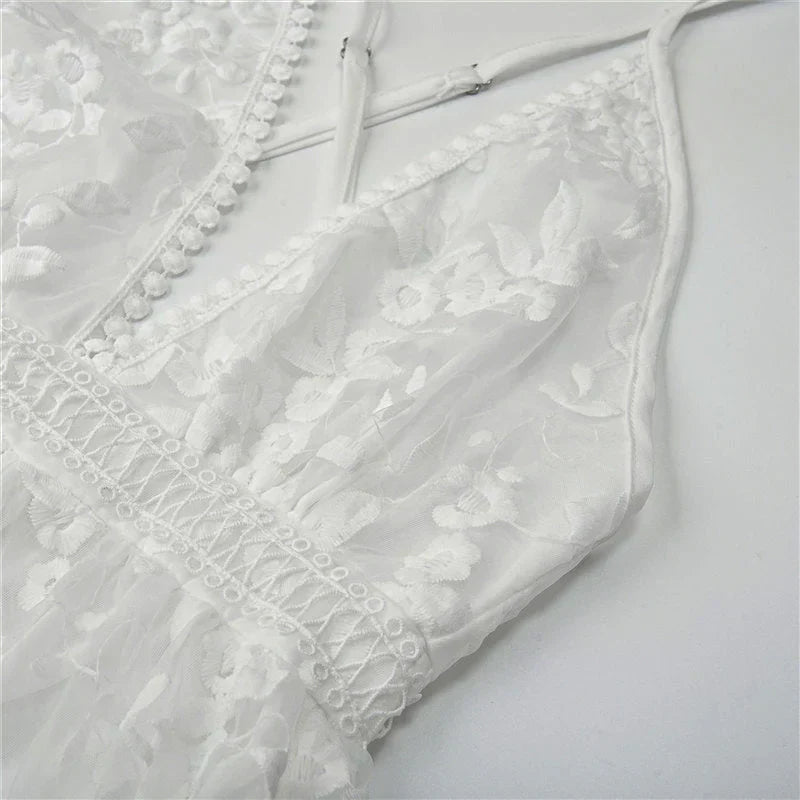 Don't forget to shine on New Year's Eve or any other summer festival. This short party dress is the ideal choice for these occasions, promoting an atmosphere of joy and elegance. Catch the eye and receive compliments with the White Embroidered Lace Short Party Dress. Get yours now!