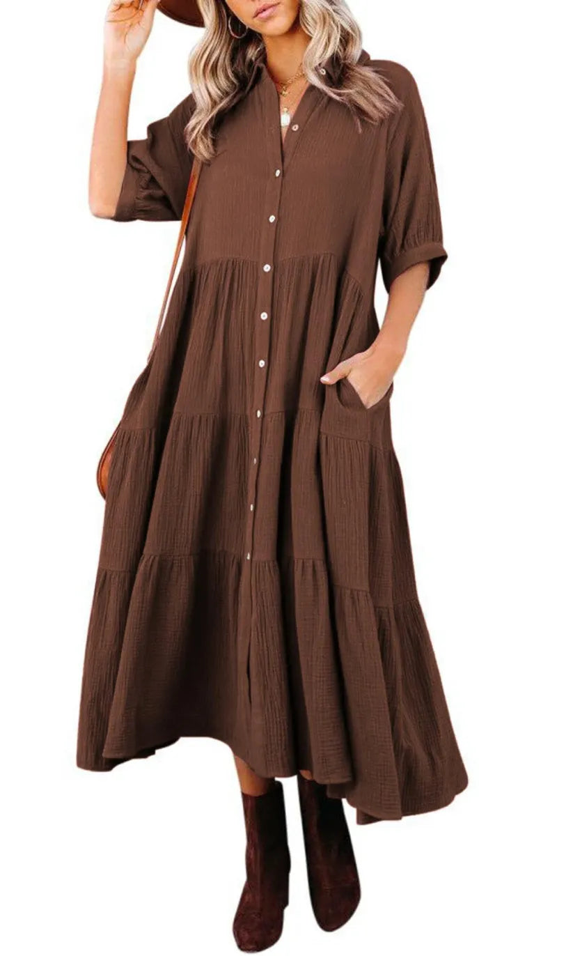 This flowy pocket with dress is the perfect combination of shirt and skirt. Wear it to take a walk on the beach or go for a vacation this summer.